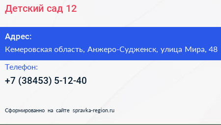 Детский сад №12 по адресу Кемеровская область, Анжеро-Судженск, улица Мира, 48 в дальнейшем Организация, размещена в следующих категориях: