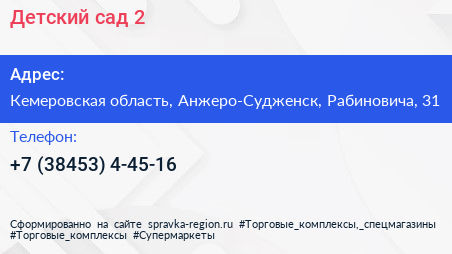 Детский сад №2 по адресу Кемеровская область, Анжеро-Судженск, Рабиновича, 31 в дальнейшем Организация, размещена в следующих категориях: