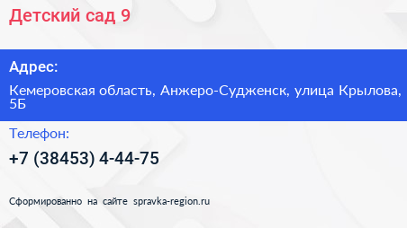 Детский сад №9 по адресу Кемеровская область, Анжеро-Судженск, улица Крылова, 5Б в дальнейшем Организация, размещена в следующих категориях: