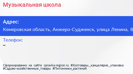 Музыкальная школа по адресу Кемеровская область, Анжеро-Судженск, улица Ленина, 8 в дальнейшем Организация, размещена в следующих категориях: