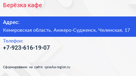 Берёзка, кафе по адресу Кемеровская область, Анжеро-Судженск, Челинская, 17 в дальнейшем Организация, размещена в следующих категориях: