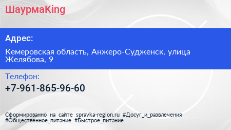 ШаурмаKing по адресу Кемеровская область, Анжеро-Судженск, улица Желябова, 9 в дальнейшем Организация, размещена в следующих категориях: