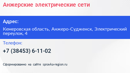 Анжерские электрические сети по адресу Кемеровская область, Анжеро-Судженск, Электрический переулок, 4 в дальнейшем Организация, размещена в следующих категориях:
