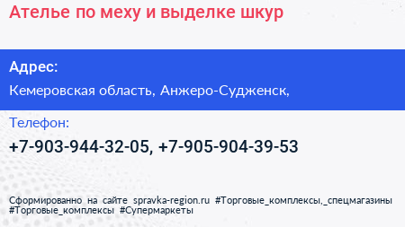 Ателье по меху и выделке шкур по адресу Кемеровская область, Анжеро-Судженск, в дальнейшем Организация, размещена в следующих категориях: