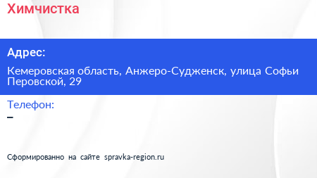 Химчистка по адресу Кемеровская область, Анжеро-Судженск, улица Софьи Перовской, 29 в дальнейшем Организация, размещена в следующих категориях: