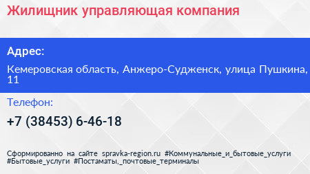 Жилищник, управляющая компания по адресу Кемеровская область, Анжеро-Судженск, улица Пушкина, 11 в дальнейшем Организация, размещена в следующих категориях:
