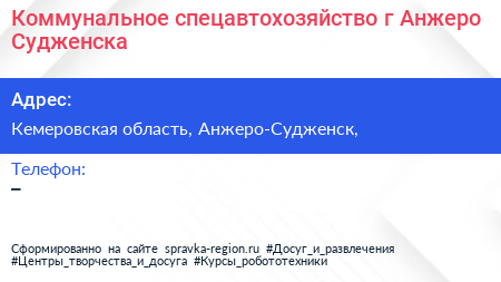 Коммунальное спецавтохозяйство г. Анжеро-Судженска по адресу Кемеровская область, Анжеро-Судженск, в дальнейшем Организация, размещена в следующих категориях: