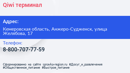 Qiwi, терминал по адресу Кемеровская область, Анжеро-Судженск, улица Желябова, 17 в дальнейшем Организация, размещена в следующих категориях: