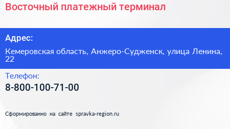 Восточный, платежный терминал по адресу Кемеровская область, Анжеро-Судженск, улица Ленина, 22 в дальнейшем Организация, размещена в следующих категориях: