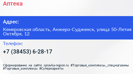 Аптека по адресу Кемеровская область, Анжеро-Судженск, улица 50-Летия Октября, 12 в дальнейшем Организация, размещена в следующих категориях: