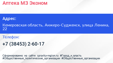 Аптека МЗ Эконом по адресу Кемеровская область, Анжеро-Судженск, улица Ленина, 22 в дальнейшем Организация, размещена в следующих категориях: