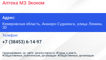 Аптека МЗ Эконом по адресу Кемеровская область, Анжеро-Судженск, улица Ленина, 30 в дальнейшем Организация, размещена в следующих категориях: