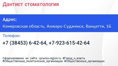 Дантист, стоматология по адресу Кемеровская область, Анжеро-Судженск, Ванцетти, 1Б в дальнейшем Организация, размещена в следующих категориях: