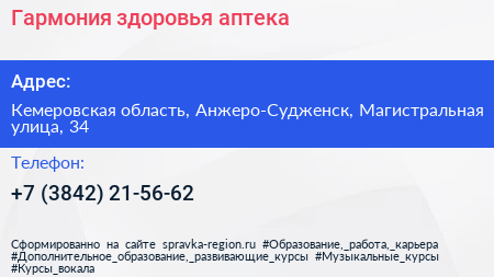 Гармония здоровья, аптека по адресу Кемеровская область, Анжеро-Судженск, Магистральная улица, 34 в дальнейшем Организация, размещена в следующих категориях: