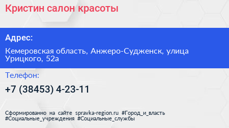 Кристин, салон красоты по адресу Кемеровская область, Анжеро-Судженск, улица Урицкого, 52а в дальнейшем Организация, размещена в следующих категориях: