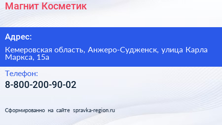 Магнит Косметик по адресу Кемеровская область, Анжеро-Судженск, улица Карла Маркса, 15а в дальнейшем Организация, размещена в следующих категориях: