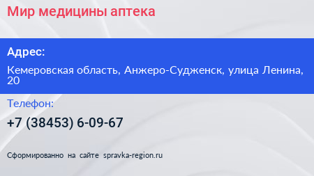 Мир медицины, аптека по адресу Кемеровская область, Анжеро-Судженск, улица Ленина, 20 в дальнейшем Организация, размещена в следующих категориях: