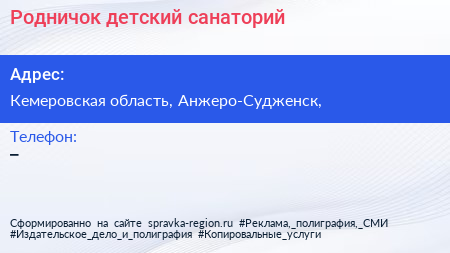 Родничок, детский санаторий по адресу Кемеровская область, Анжеро-Судженск, в дальнейшем Организация, размещена в следующих категориях: