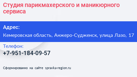 Студия парикмахерского и маникюрного сервиса по адресу Кемеровская область, Анжеро-Судженск, улица Лазо, 17 в дальнейшем Организация, размещена в следующих категориях: