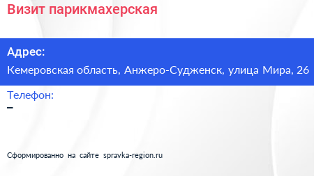 Визит, парикмахерская по адресу Кемеровская область, Анжеро-Судженск, улица Мира, 26 в дальнейшем Организация, размещена в следующих категориях: