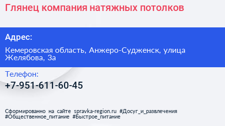 Глянец, компания натяжных потолков по адресу Кемеровская область, Анжеро-Судженск, улица Желябова, 3а в дальнейшем Организация, размещена в следующих категориях: