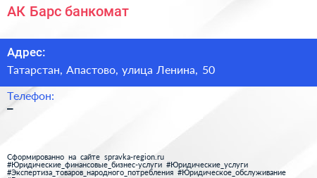 АК Барс, банкомат по адресу Татарстан, Апастово, улица Ленина, 50 в дальнейшем Организация, размещена в следующих категориях: