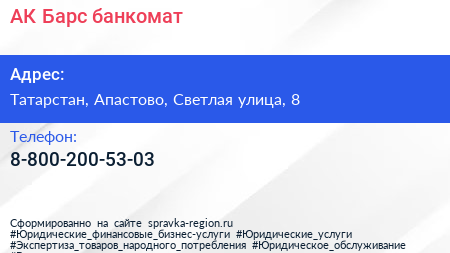 АК Барс, банкомат по адресу Татарстан, Апастово, Светлая улица, 8 в дальнейшем Организация, размещена в следующих категориях: