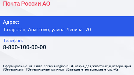 Почта России, АО по адресу Татарстан, Апастово, улица Ленина, 70 в дальнейшем Организация, размещена в следующих категориях: