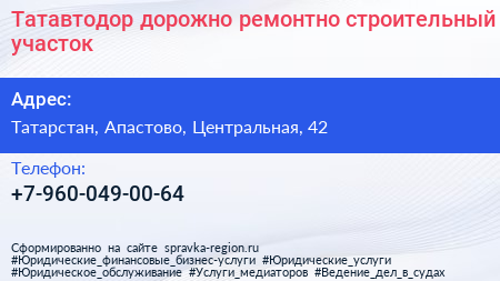 Татавтодор, дорожно-ремонтно-строительный участок по адресу Татарстан, Апастово, Центральная, 42 в дальнейшем Организация, размещена в следующих категориях: