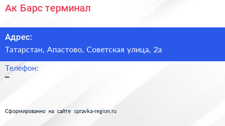 Ак Барс, терминал по адресу Татарстан, Апастово, Советская улица, 2а в дальнейшем Организация, размещена в следующих категориях: