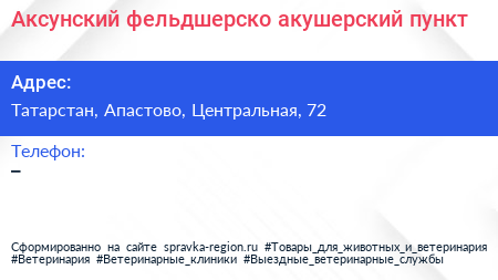 Аксунский фельдшерско-акушерский пункт по адресу Татарстан, Апастово, Центральная, 72 в дальнейшем Организация, размещена в следующих категориях: