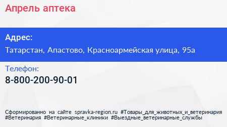 Апрель, аптека по адресу Татарстан, Апастово, Красноармейская улица, 95а в дальнейшем Организация, размещена в следующих категориях: