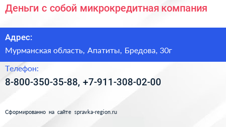 Деньги с собой, микрокредитная компания по адресу Мурманская область, Апатиты, Бредова, 30г в дальнейшем Организация, размещена в следующих категориях: