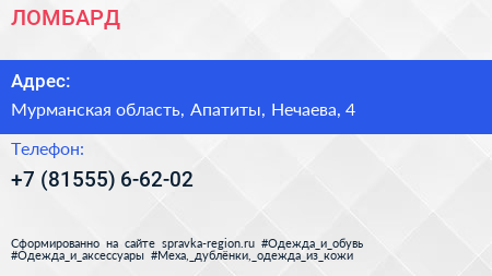 ЛОМБАРД по адресу Мурманская область, Апатиты, Нечаева, 4 в дальнейшем Организация, размещена в следующих категориях: