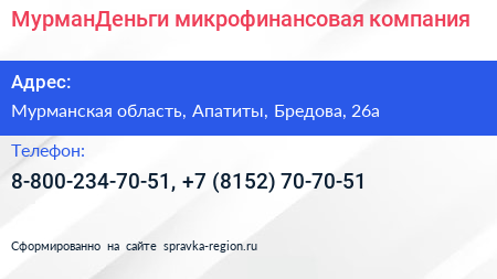МурманДеньги, микрофинансовая компания по адресу Мурманская область, Апатиты, Бредова, 26а в дальнейшем Организация, размещена в следующих категориях: