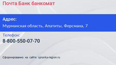 Почта Банк, банкомат по адресу Мурманская область, Апатиты, Ферсмана, 7 в дальнейшем Организация, размещена в следующих категориях: