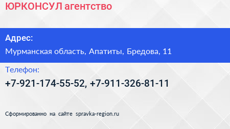 ЮРКОНСУЛ, агентство по адресу Мурманская область, Апатиты, Бредова, 11 в дальнейшем Организация, размещена в следующих категориях: