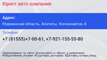 Юрист-авто, компания по адресу Мурманская область, Апатиты, Космонавтов, 8 в дальнейшем Организация, размещена в следующих категориях:
