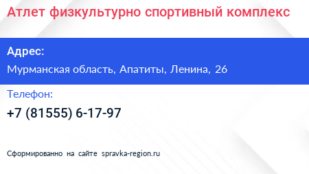 Атлет, физкультурно-спортивный комплекс по адресу Мурманская область, Апатиты, Ленина, 26 в дальнейшем Организация, размещена в следующих категориях: