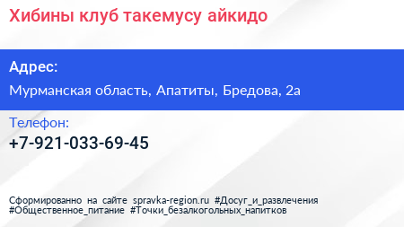 Хибины, клуб такемусу айкидо по адресу Мурманская область, Апатиты, Бредова, 2а в дальнейшем Организация, размещена в следующих категориях: