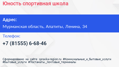 Юность, спортивная школа по адресу Мурманская область, Апатиты, Ленина, 34 в дальнейшем Организация, размещена в следующих категориях: