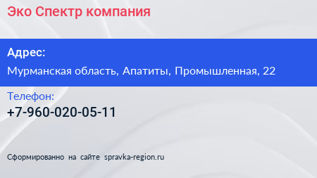 Эко Спектр, компания по адресу Мурманская область, Апатиты, Промышленная, 22 в дальнейшем Организация, размещена в следующих категориях: