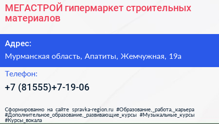 МЕГАСТРОЙ, гипермаркет строительных материалов по адресу Мурманская область, Апатиты, Жемчужная, 19а в дальнейшем Организация, размещена в следующих категориях: