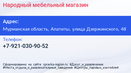 Народный, мебельный магазин по адресу Мурманская область, Апатиты, улица Дзержинского, 48 в дальнейшем Организация, размещена в следующих категориях: