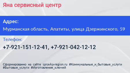Яна, сервисный центр по адресу Мурманская область, Апатиты, улица Дзержинского, 59 в дальнейшем Организация, размещена в следующих категориях: