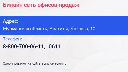 Билайн, сеть офисов продаж по адресу Мурманская область, Апатиты, Козлова, 10 в дальнейшем Организация, размещена в следующих категориях:
