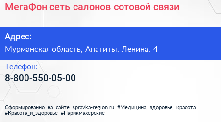 МегаФон, сеть салонов сотовой связи по адресу Мурманская область, Апатиты, Ленина, 4 в дальнейшем Организация, размещена в следующих категориях:
