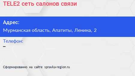 TELE2, сеть салонов связи по адресу Мурманская область, Апатиты, Ленина, 2 в дальнейшем Организация, размещена в следующих категориях: