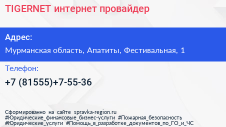 TIGERNET, интернет-провайдер по адресу Мурманская область, Апатиты, Фестивальная, 1 в дальнейшем Организация, размещена в следующих категориях:
