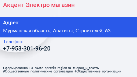 Акцент Электро, магазин по адресу Мурманская область, Апатиты, Строителей, 63 в дальнейшем Организация, размещена в следующих категориях: